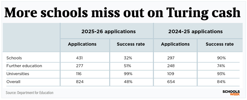 Department for Education data shows just 32 per cent (140) of school applications to the Turing Scheme this year were successful, down from 90 per cent 12 months ago.