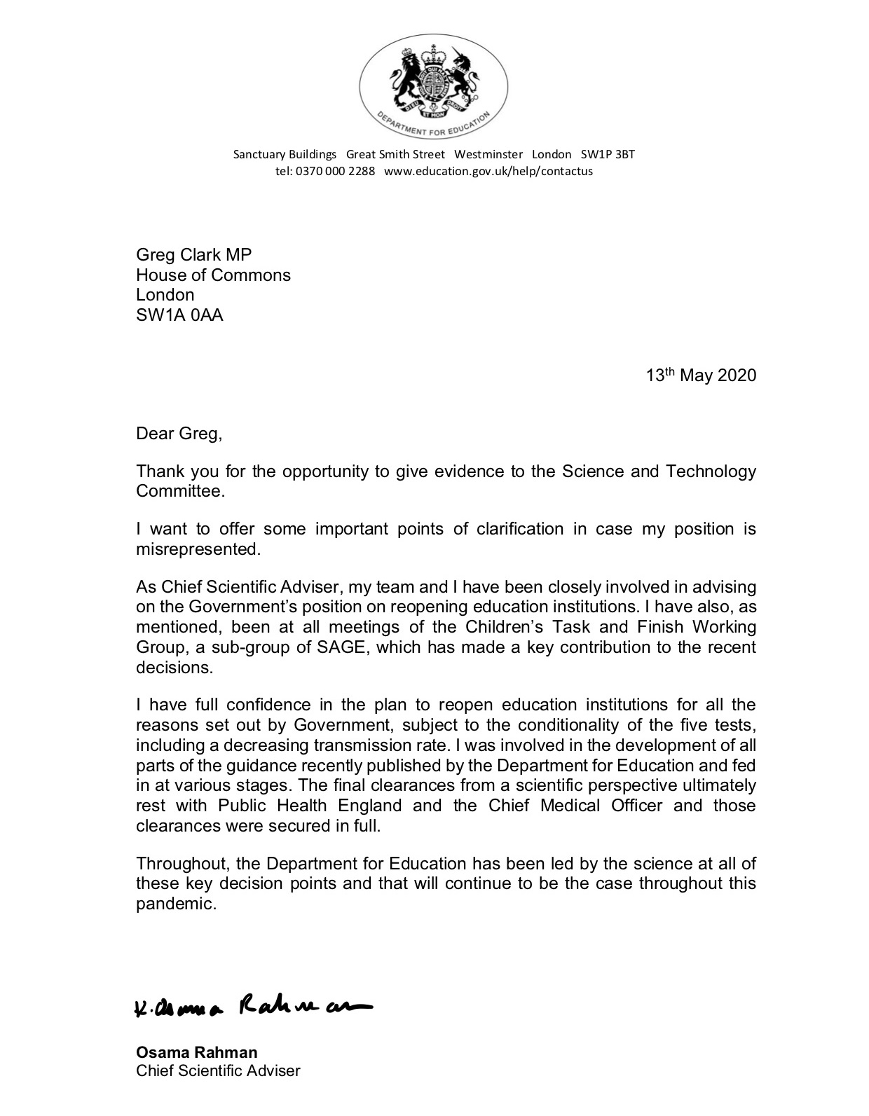 Speaking at the science and technology committee, earlier today, Osama Rahman said he had not assessed the effectiveness of government guidance published yesterday on how to reopen schools safely.