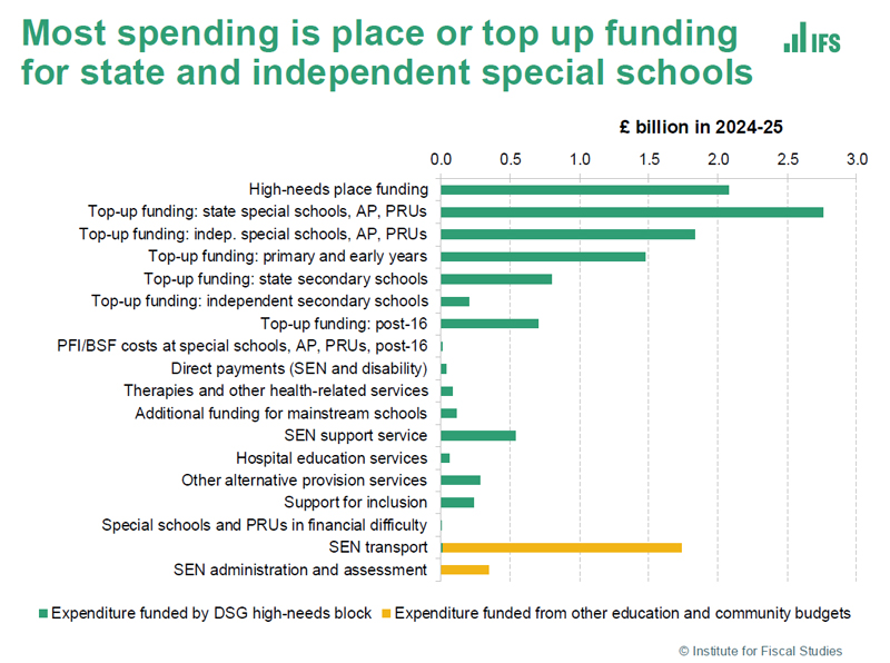 It currently spends around £12 billion on high-needs funding, according to the Institute for Fiscal Studies. But DfE data suggests just £2.4bn was given to schools in SEN funding in 2023-24.