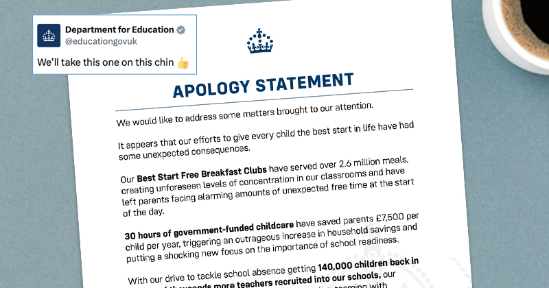 The tongue-in-cheek post – framed as an “apology statement” – lists the supposed merits of the government’s free breakfast clubs scheme, its expansion of free childcare, and drive to tackle pupil absence.