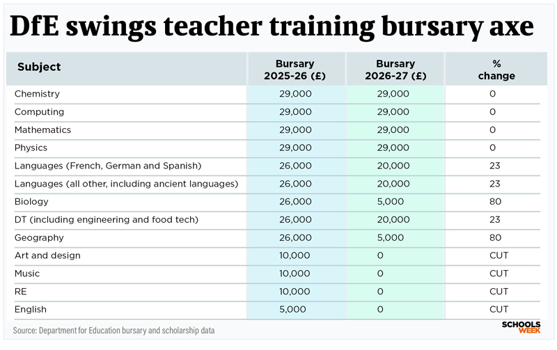 The government has swung the axe on teacher training incentives – including cutting funding for shortage subjects such as maths and foreign languages.