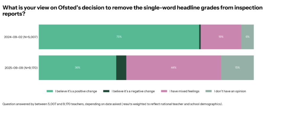 Far fewer teachers now say Ofsted’s move to ditch headline grades was ‘positive’ amid concern over the watchdog’s new inspection plan.