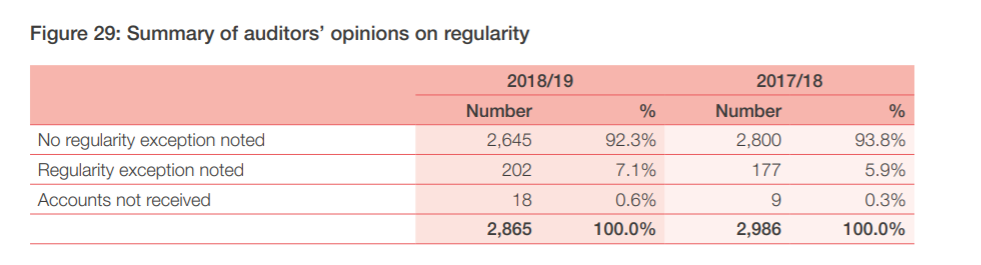 The number of trusts where independent auditors found cash was spent outside of the rules rose to 202 (7.1 per cent of trusts) in 2018-19, compared to 177 trusts (5.9 per cent) in 2017-18.