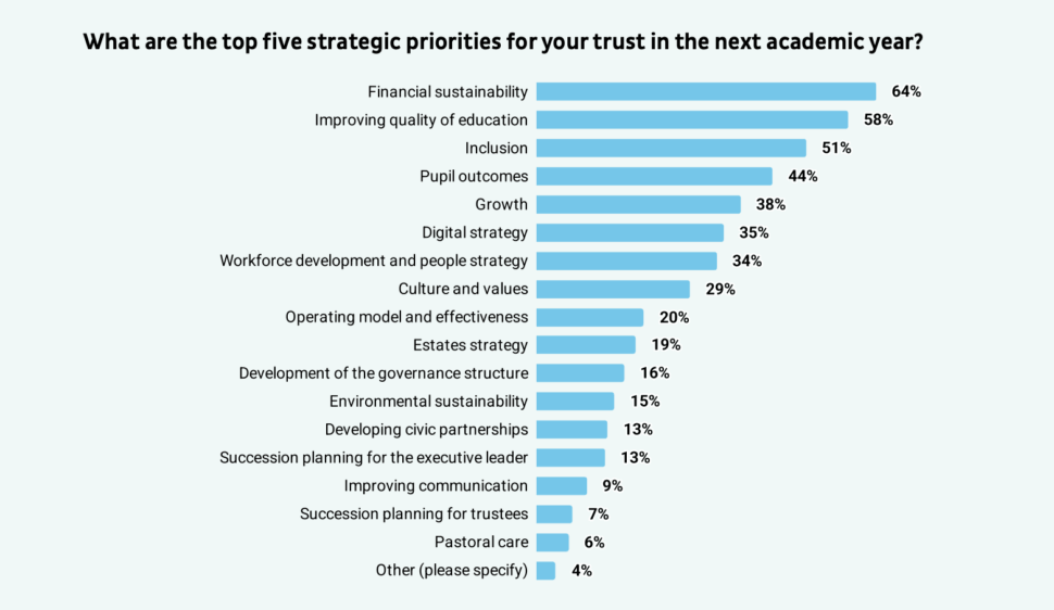 Financial sustainability was CEOs’ number one priority this year – for the second year running. As well as being the most common priority, it was also seen as the most challenging for trusts, the survey by Edurio found.