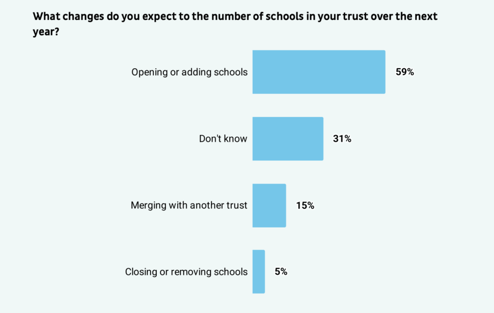 While 60 per cent of CEOs said they expect their trust to open or add schools, 15 per cent expected to merge (one in seven), and five per cent envisaged closing or removing schools.