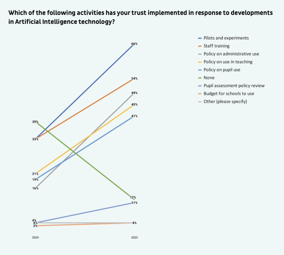 There has also been a rise in trusts creating policies on the use of AI in administrative use, teaching, and its use by pupils.