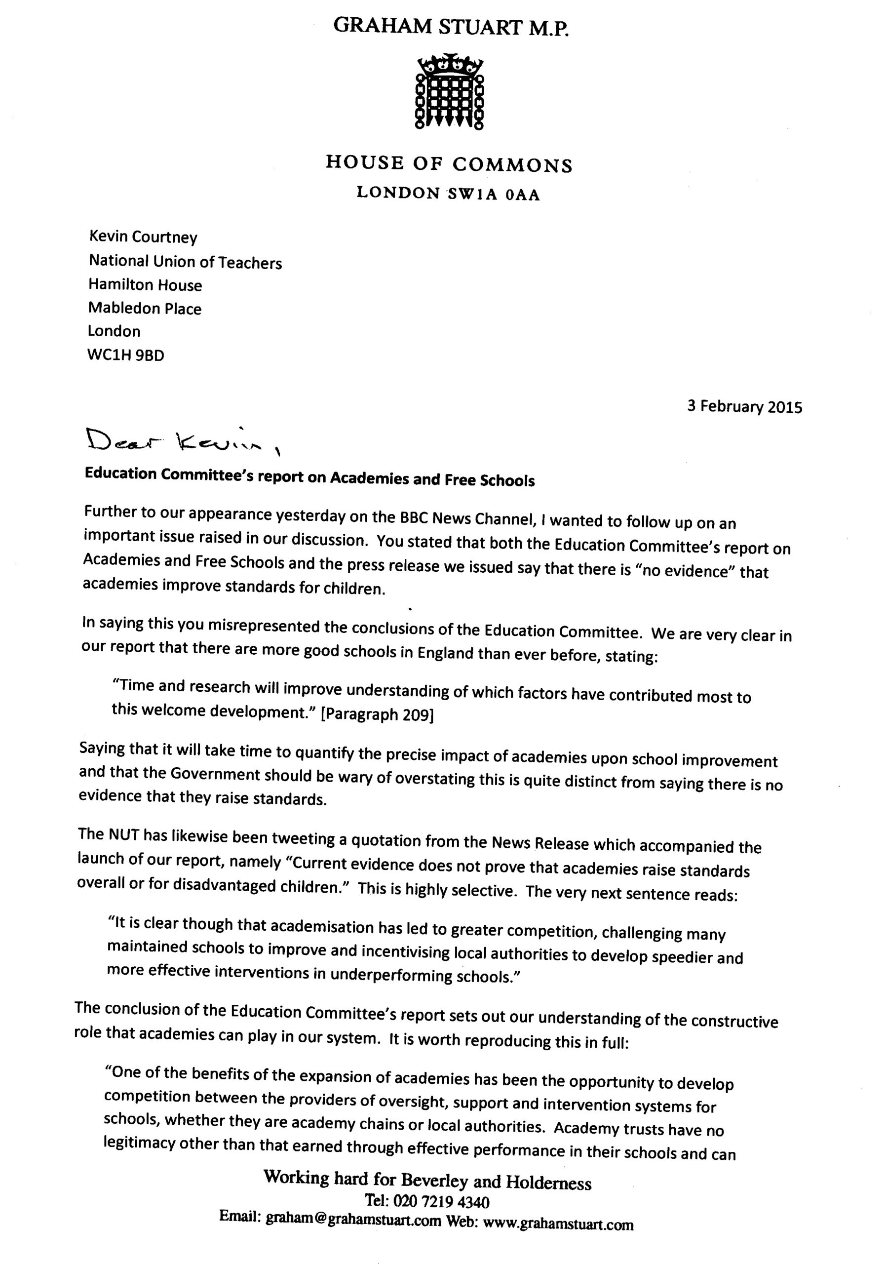The chair of the education select committee has written to deputy general secretary of the NUT Kevin Courtney accusing him of misrepresenting its views on academies.