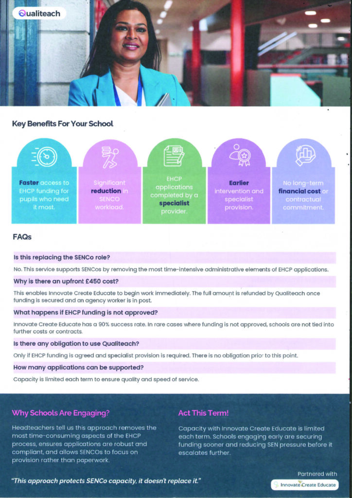 Leaflets from Qualiteach Education Group said schools can “outsource the most time-intensive elements” of the EHCP application process to “experienced specialists, without incurring long-term costs”.