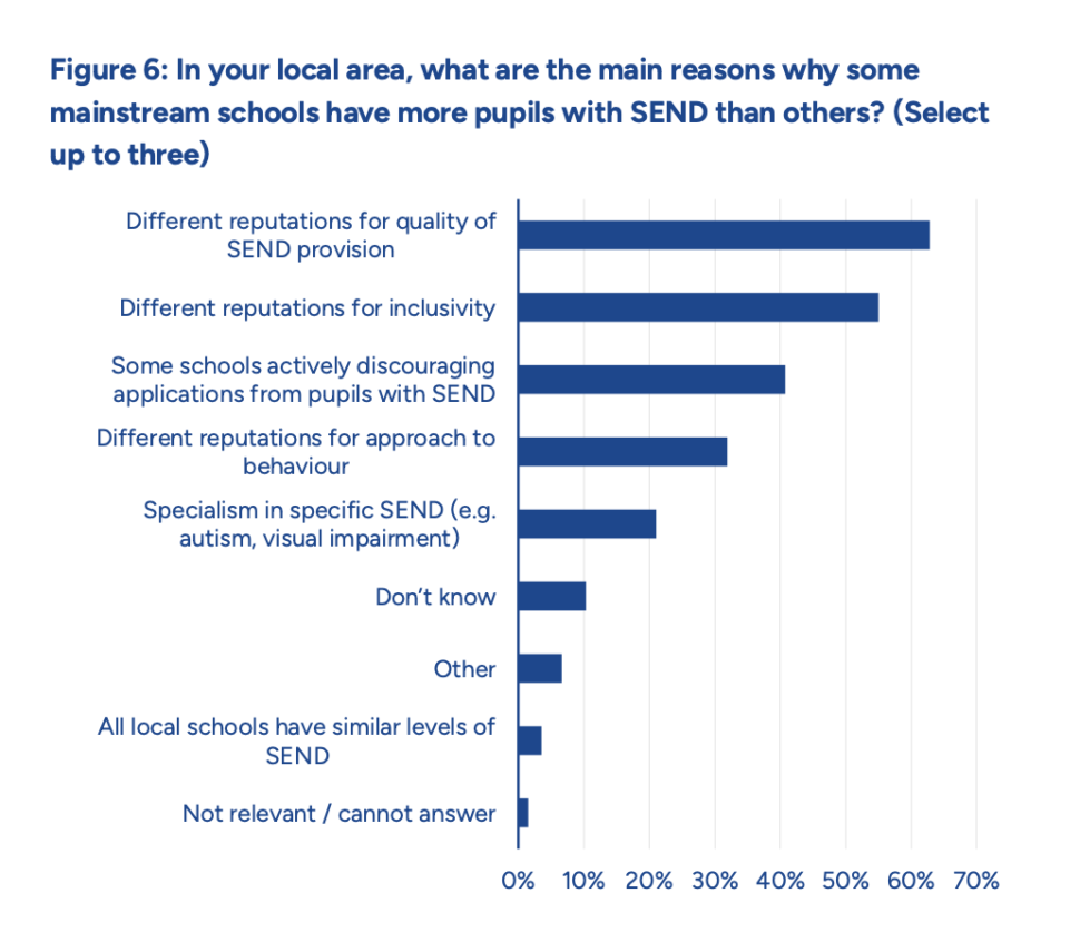 Senior leaders also reported that reputation of quality of SEND provision (63 per cent) and inclusivity (55 per cent) were important factors for differing admissions.