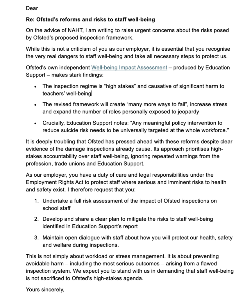 The NAHT letter calls on employers to “undertake a full risk assessment” of the impact the new Ofsted inspections will have on school staff.